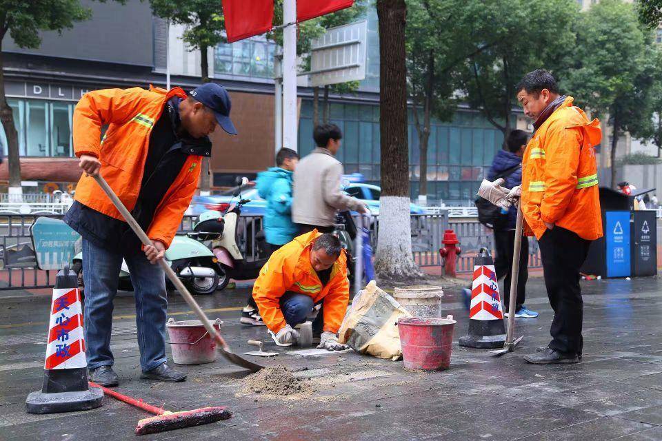 2月19日,大年初三,长沙市天心区市政设施维护中心一线维护值班分队在解放西路作业施工,处置人行道板松动断裂问题,确保市民和外地游客脚下安全。
