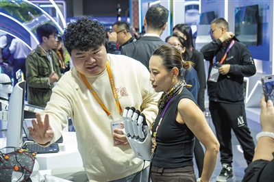 观众在第八届进博会国家展中国馆了解非侵入式脑机接口机器人。新华社记者 丁赫 摄